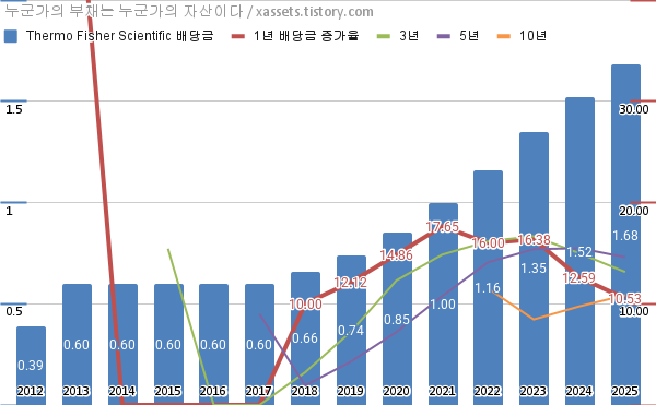 써모피셔 사이언티픽 배당금 및 배당성장률 차트 (2012년~2025년)