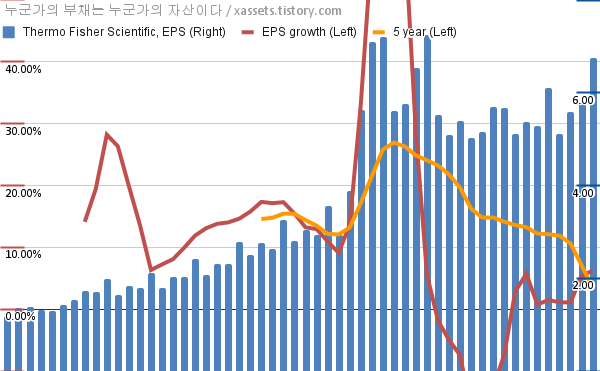- 포스팅일 기준, 써모피셔 사이언티픽의 1, 5년 연평균 EPS 성장률은 6.22%, 3.50%이다.