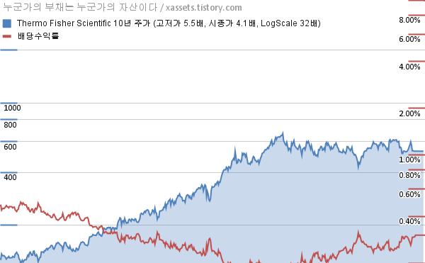 써모피셔 사이언티픽 배당수익률 및 주가 상승률 차트 (2015년~2025년)