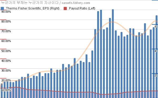 써모피셔 사이언티픽 EPS 성장률, 배당성향 차트 (2012년~2025년)