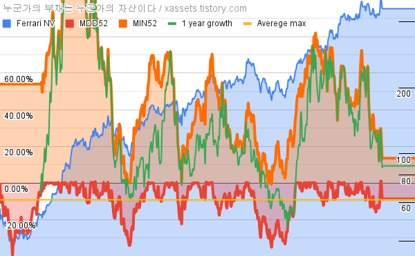 - 페라리의 9년 평균 MDD는 -9.24%고, 52주 최저가 대비 평균 상승률은 49.11%다.