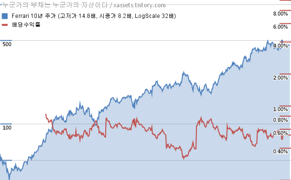 페라리 배당수익률 및 주가 상승률 차트 (2015년~2025년)