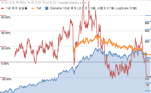 - 포스팅일 기준, 다나허의 1, 3, 5, 10년 연평균 주가상승률은 -18.80%, -4.91%, 9.57%, 13.76%이다.