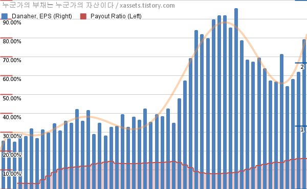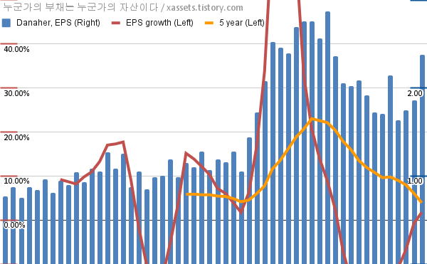 - 포스팅일 기준, 다나허의 1, 5년 연평균 EPS 성장률은 1.74%, 3.91%이다.