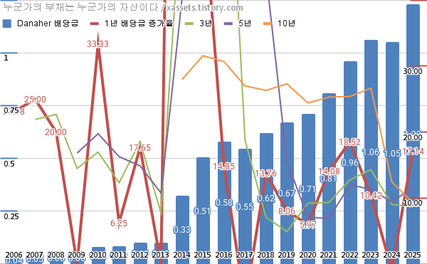 다나허 배당금 및 배당성장률 차트 (2006년~2025년)