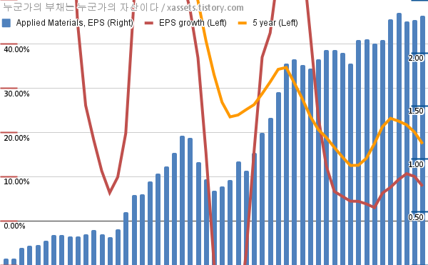- 포스팅일 기준, 어플라이드 머티어리얼즈의 1, 5년 연평균 EPS 성장률은 7.85%, 17.44%이다.