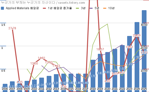 어플라이드 머티어리얼즈 배당금 및 배당성장률 차트 (2006년~2025년)