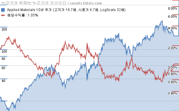 - 포스팅일 기준, 어플라이드 머티어리얼즈의 1, 3, 5, 10년 연평균 주가상승률은 -27.65%, 3.54%, 27.56%, 21.18%이다.