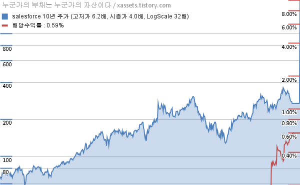 세일즈포스 배당수익률 및 주가 상승률 차트 (2015년~2025년)