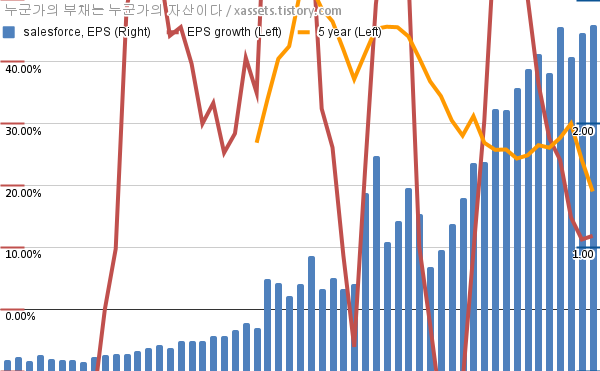 - 포스팅일 기준, 세일즈포스의 1, 5년 연평균 EPS 성장률은 11.86%, 19.04%이다.