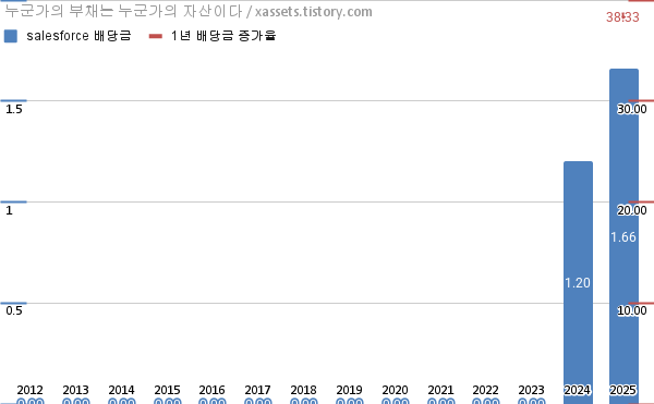 - 세일즈포스의 연평균 배당성장률은 1년 38.33%이다. (2025년 기준)