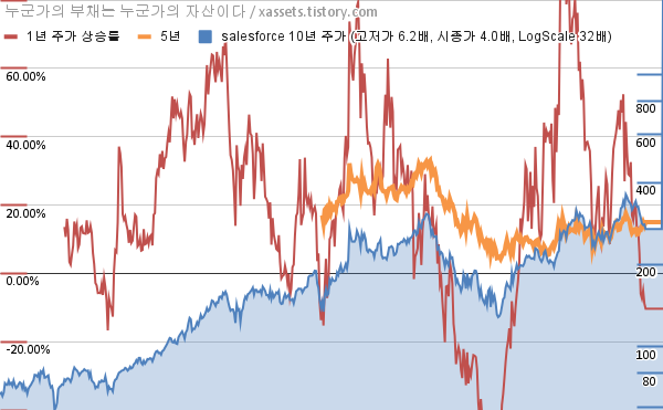 - 포스팅일 기준, 세일즈포스의 1, 3, 5, 10년 연평균 주가상승률은 -10.36%, 8.35%, 14.99%, 14.84%이다.