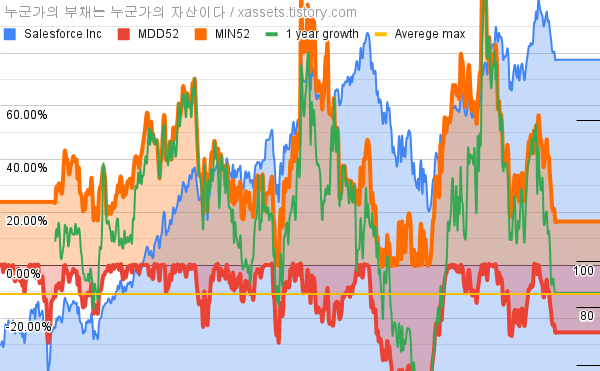 - 세일즈포스의 10년 평균 MDD는 -10.95%고, 52주 최저가 대비 평균 상승률은 38.42%다.