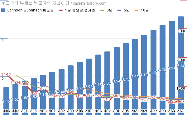 - 존슨앤존슨의 연평균 배당성장률은 1년 4.68%, 3년 4.92%, 5년 5.25%, 10년 5.71%이다. (2025년 기준)