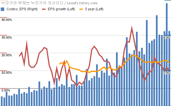 - 포스팅일 기준, 코스트코의 1, 5년 연평균 EPS 성장률은 9.95%, 14.47%이다.