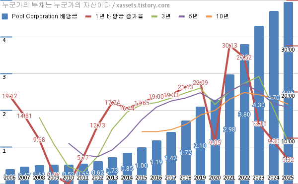 - 지난 2025년 4월 30일에 풀 코퍼레이션 Pool Corporation (NASDAQ:POOL)이 배당금 증액을 공시했다. 분기당 배당금이 $1.2에서 $1.25로 전 분기 대비 4.17% 증가하고, 연간 지급 배당금은 전년도 대비 5.32% 증가한다.