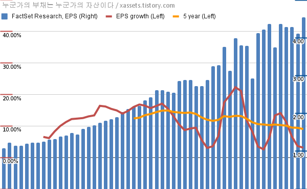 - 포스팅일 기준, 팩트셋 리서치의 1, 5년 연평균 EPS 성장률은 3.11%, 9.04%이다.