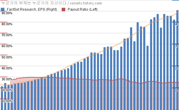 - 팩트셋 리서치의 배당성장률은 점차 낮아지고 있다. 배당수익률도 낮아지는 추세였다가 이제는 일정한 구간을 형성하고 있다. EPS 성장 추세가 낮아지고는 있지만 아직은 평균 10% 정도의 성장을 하고 있고, 배당성향도 여력이 충분한 편인데, 주가가 주춤주춤 하면서 PER도 차츰 낮아지고 있다. 자사주도 한동안 중단된 상태로 있는 것으로 보아 전체적으로 큰 성장 추세는 꺾인 느낌이 든다. 아주 나쁜 상황은 아니지만, 보통은 이런 경우 내부적으로 큰 혁신이 일어나지 않는 한 이 추세를 벗어나기는 힘들다.