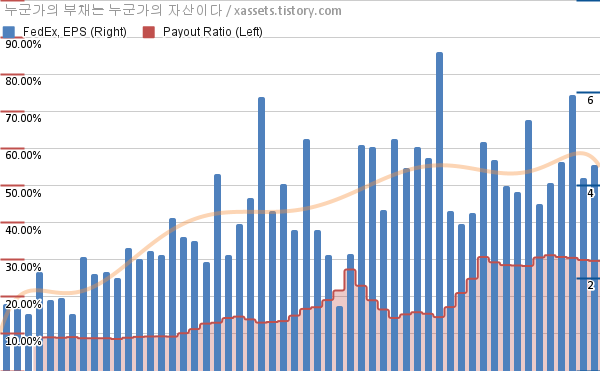 페덱스 EPS 성장률, 배당성향 차트 (2012년~2025년)