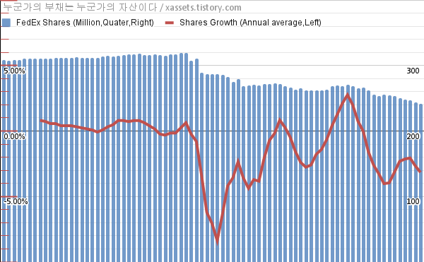 - 지난 1년 동안 페덱스는 평균 3.16%의 자사주를 매입-소각했다.