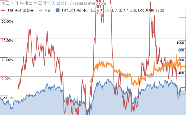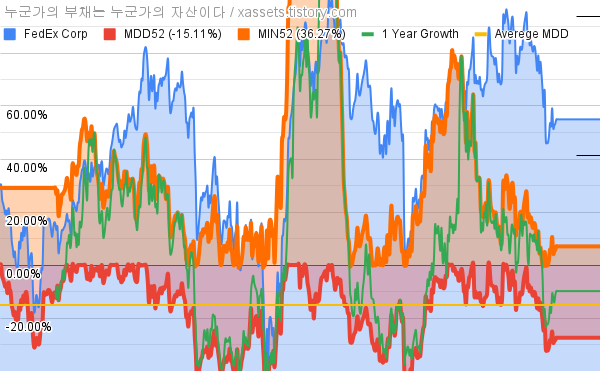 - 페덱스의 10년 평균 MDD는 -15.11%고, 52주 최저가 대비 평균 상승률은 36.27%다.