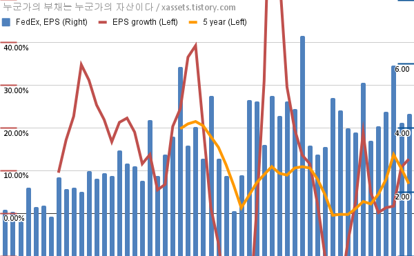 - 포스팅일 기준, 페덱스의 1, 5년 연평균 EPS 성장률은 12.71%, 6.93%이다.