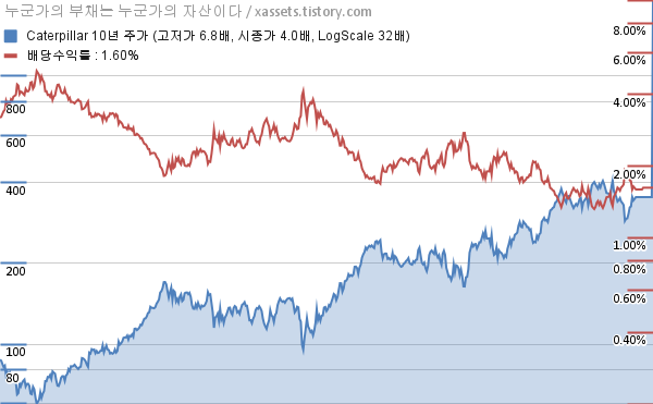 - 캐터필러의 배당성장률은 7% 수준에서 안정적으로 유지되고 있다. 배당성장률 변동폭이 안정되어서인지 주가 변동성도 비교적 줄어들었고, 주가 성장률도 조금씩 높은 상태로 유지되면서 배당수익률 또한 차분하게 낮아지고 있다. EPS가 꾸준히 성장하는 것이 아니라 경제 상황에 따라서 주기성을 가지고 널뛰고 있음에도 PER이 실적 성장세에 비해서 높아지고 있는 이유는 배당성향상 충분한 여력이 있고, 자사주 소각도 꾸준하고, 무엇보다 앞에 말한 데로 비록 살짝 낮은 수준이지만 배당성장률을 안정적으로 유지해 주는 것이 큰 요인으로 보인다.