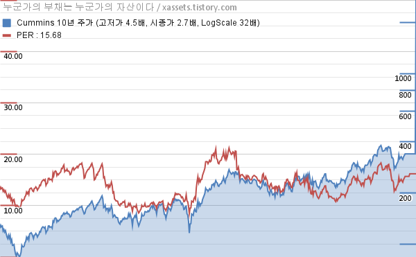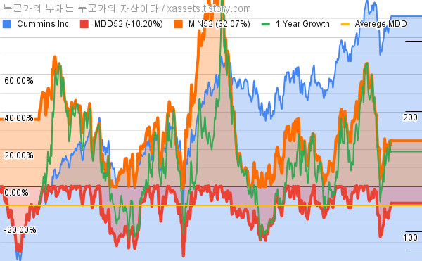 - 커민스의 10년 평균 MDD는 -10.20%고, 52주 최저가 대비 평균 상승률은 32.07%다.