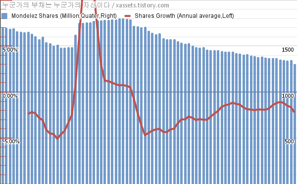 - 지난 1년 동안 몬델리즈는 평균 2.23%의 자사주를 매입-소각했다.