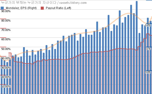 몬델리즈 EPS 성장률, 배당성향 차트 (2012년~2025년)