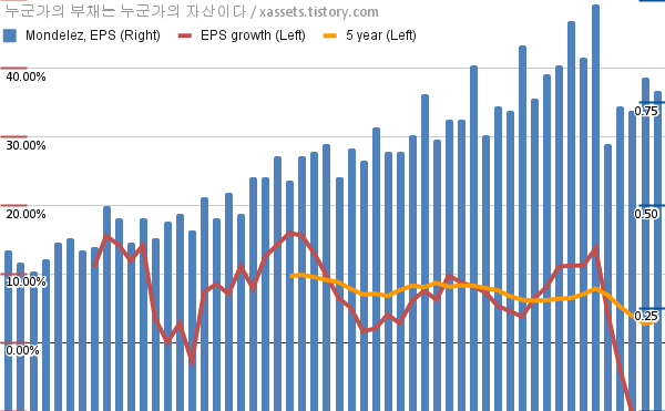 - 포스팅일 기준, 몬델리즈의 1, 5년 연평균 EPS 성장률은 -11.30%, 3.15%이다.