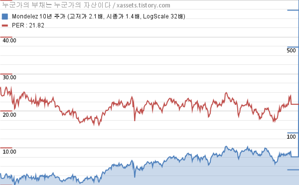 - 몬델리즈의 포스팅일 기준 PER은 21.82이다.