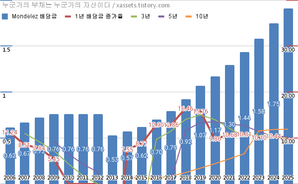 몬델리즈 배당금 및 배당성장률 차트 (2006년~2025년)