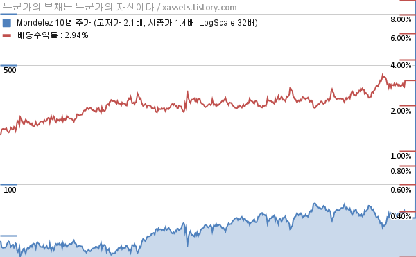 - 포스팅일 기준, 몬델리즈의 1, 3, 5, 10년 연평균 주가상승률은 -9.55%, 0.08%, 2.83%, 3.24%이다.