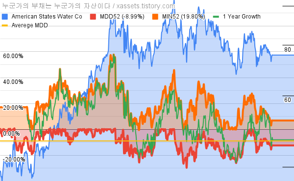 - 아메리칸 스테이츠 워터의 10년 평균 MDD는 -8.99%고, 52주 최저가 대비 평균 상승률은 19.80%다.