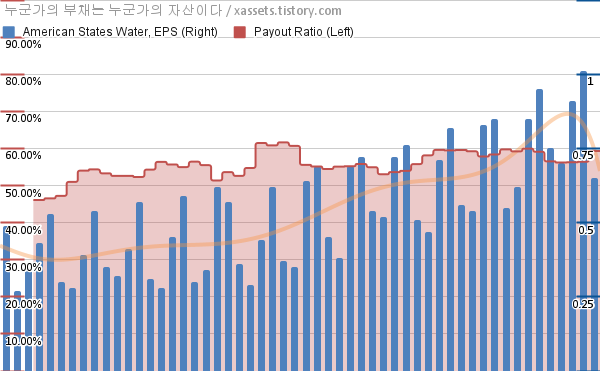 아메리칸 스테이츠 워터 EPS 성장률, 배당성향 차트 (2012년~2025년)