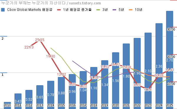 - 지난 2025년 8월 14일에 씨보 글로벌 마켓 Cboe Global Markets (BATS:CBOE)이 배당금 증액을 공시했다. 분기당 배당금이 $0.63에서 $0.72로 전 분기 대비 14.29% 증가하고, 연간 지급 배당금은 전년도 대비 14.41% 증가한다.