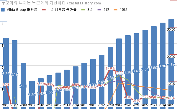 - 알트리아 그룹의 연평균 배당성장률은 1년 4.04%, 3년 4.22%, 5년 4.04%, 10년 6.87%이다. (2025년 기준)
