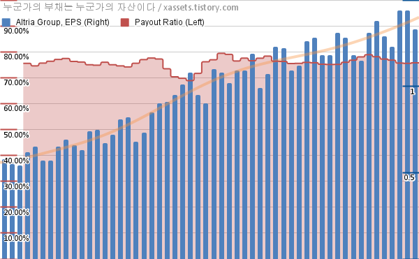알트리아 그룹 EPS 성장률, 배당성향 차트 (2012년~2025년)