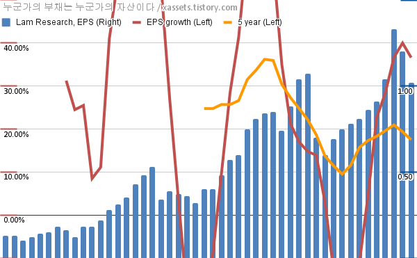 - 포스팅일 기준, 램리서치의 1, 5년 연평균 EPS 성장률은 36.61%, 17.49%이다.