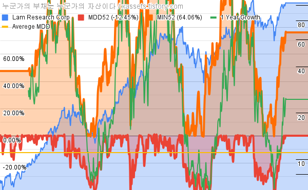 - 램리서치의 10년 평균 MDD는 -12.45%고, 52주 최저가 대비 평균 상승률은 64.06%다.