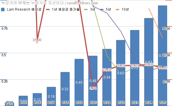 램리서치 배당금 및 배당성장률 차트 (2014년~2025년)