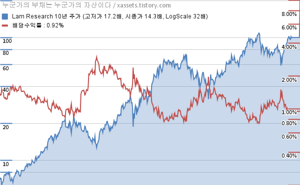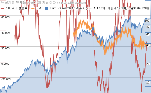 - 포스팅일 기준, 램리서치의 1, 3, 5, 10년 연평균 주가상승률은 18.10%, 30.21%, 23.33%, 30.51%이다.