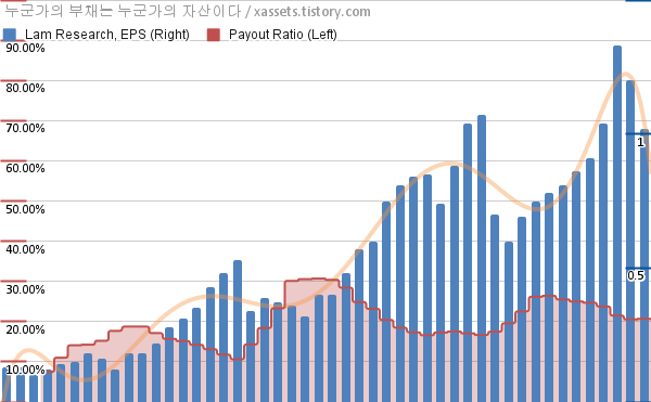램리서치 EPS 성장률, 배당성향 차트 (2014년~2025년)