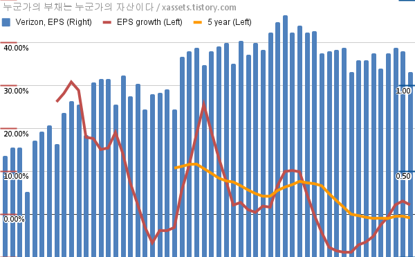 - 포스팅일 기준, 버라이즌의 1, 5년 연평균 EPS 성장률은 2.18%, -0.87%이다.