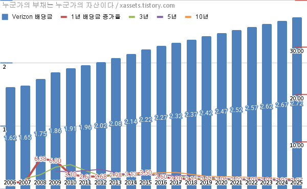 버라이즌 배당금 및 배당성장률 차트 (2006년~2025년)