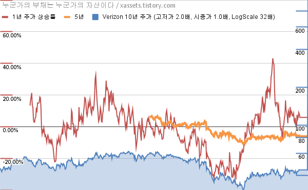- 포스팅일 기준, 버라이즌의 1, 3, 5, 10년 연평균 주가상승률은 5.86%, 2.31%, -6.07%, -0.33%이다.