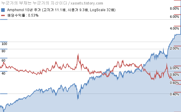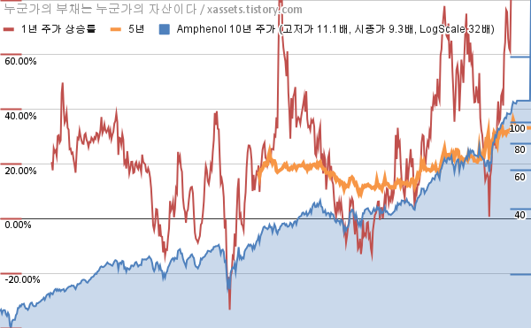 - 포스팅일 기준, 암페놀의 1, 3, 5, 10년 연평균 주가상승률은 86.26%, 52.00%, 33.22%, 24.94%이다.