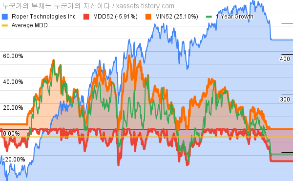 - 로퍼 테크놀로지스의 10년 평균 MDD는 -5.91%고, 52주 최저가 대비 평균 상승률은 25.10%다.