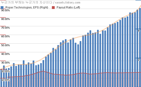 로퍼 테크놀로지스 EPS 성장률, 배당성향 차트 (2012년~2026년)